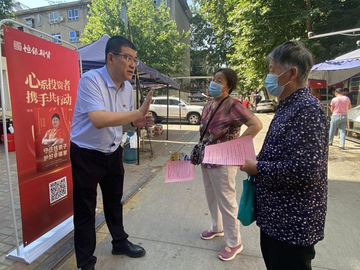 為進一步深入貫徹落實處置非法集資部際聯(lián)席會議相關(guān)工作要求,根據(jù)河北省打擊和處置非法集資工作領(lǐng)導小組印發(fā)的《2023年防范非法集資宣傳月活動動作方案的通知》,2023年6月15日,國富投資集團所屬恒銀期貨有限公司(以下簡稱“恒銀期貨”)聯(lián)合東風路派出所,由恒銀期貨總經(jīng)理湯志江、副總經(jīng)理張南組織公司各部門骨干力量深入社區(qū),開展了防范非法集資的線下宣傳活動。