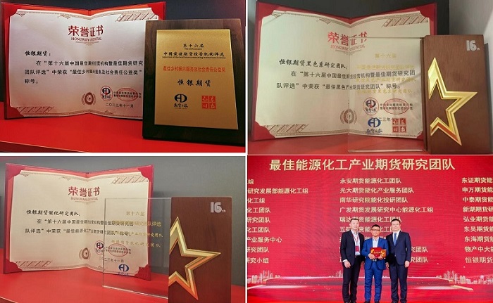 本屆評(píng)選于今年4月啟動(dòng),在歷時(shí)四個(gè)多月,經(jīng)過(guò)手機(jī)投票、專家評(píng)審等環(huán)節(jié),恒銀期貨最終榮獲“最佳能源化工產(chǎn)業(yè)期貨研究團(tuán)隊(duì)”、“最佳黑色產(chǎn)業(yè)期貨研究團(tuán)隊(duì)”以及“最佳鄉(xiāng)村振興服務(wù)及社會(huì)責(zé)任公益獎(jiǎng)”。