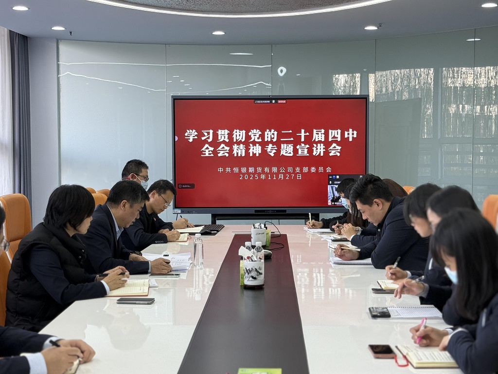 2025年11月27日,恒銀期貨有限公司在總部會(huì)議室設(shè)立主會(huì)場,召開學(xué)習(xí)貫徹黨的二十屆四中全會(huì)精神宣講報(bào)告會(huì)。河北國富投資副總經(jīng)理、恒銀公司黨支部書記、董事長李剛作專題宣講,公司全體黨員和積極分子現(xiàn)場參會(huì),公司外地黨員及從業(yè)人員通過線上會(huì)議同步學(xué)習(xí)。